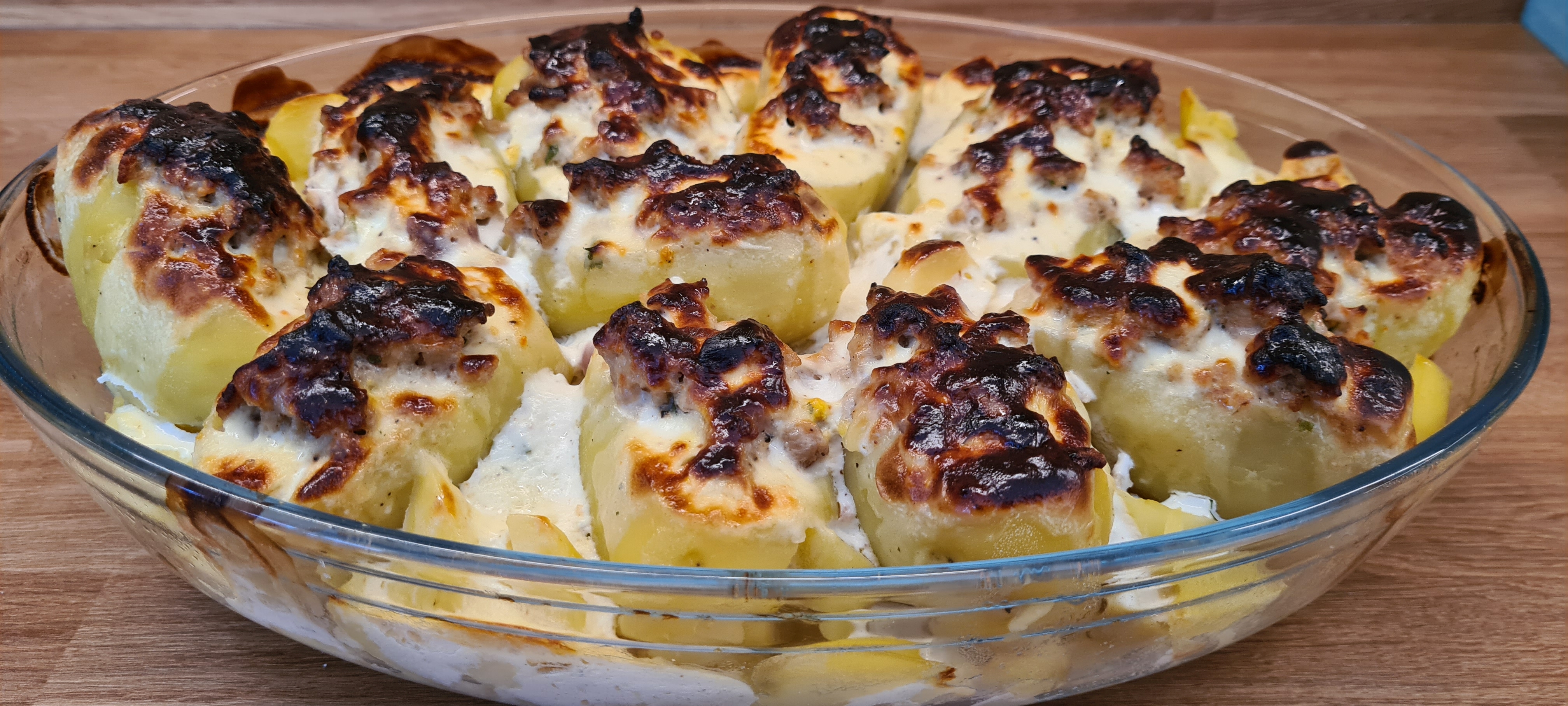 Azt gondolom, hogy minden családban van legalább egy töltött burgonya recept. Ez itt a sajátunk lett. Előre elkészíthető egytálétel, nagyon finom, bárhol megállhatja a helyét. Ha megérkeznek a vendégek csak be kell tenni a sütőbe, köret sem kell hozzá, hiszen a töltött burgonyák alatt ott van a burgonyaforgács, esetleg egy kis friss saláta mehet hozzá.